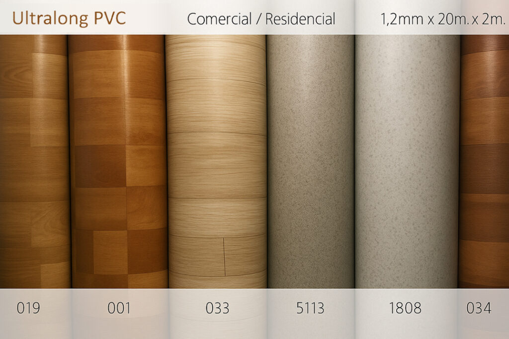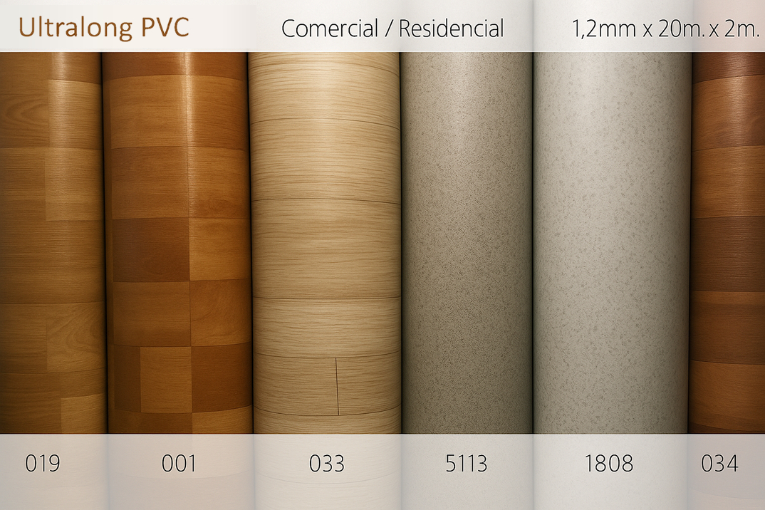 Pisos Vinílicos estampados en Rollo. Diseños Símil madera natural y granito con base solida de PVC. Poseen altísima resistencia al uso a la vez que otorgan calidez a los ambientes. Apto para uso comercial, en oficinas, restaurantes, etc.